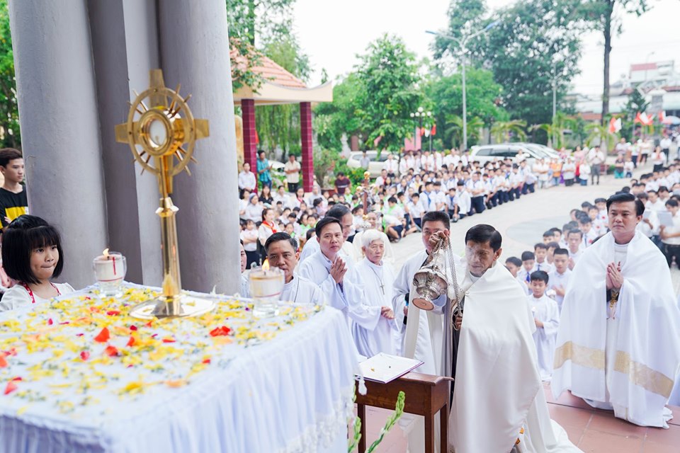 Ánh nắng ban mai dịu dàng ghé đậu trên tháp chuông cao vút, lúc 7g30 ngày 23-6-2019 tại nhà thờ giáo xứ Búng, lễ Mình Máu Chúa KiTô được tổ chức long trọng do cha chánh sở Simon Nguyễn Văn Thu chủ tế. Trước Thánh lễ, quý cha phó, 97 em Thiếu Nhi Rước lễ lần đầu, 24 em Rước lễ Bao Đồng, Thừa Tác Viên Thánh Thể, các hội đoàn cùng quý bà con giáo dân kiệu Mình Thánh Chúa chung quanh nhà thờ, cung kính thờ lạy Thánh Thể. Niềm vui nhân rộng khi Thánh giá nến cao tiến vào thánh đường dẫn hai hàng các em Thiếu Nhi- nữ cài hoa trắng trên tóc, nam cài nơ đỏ trên ngực áo- đến hàng ghế quỳ vinh dự hôm nay.