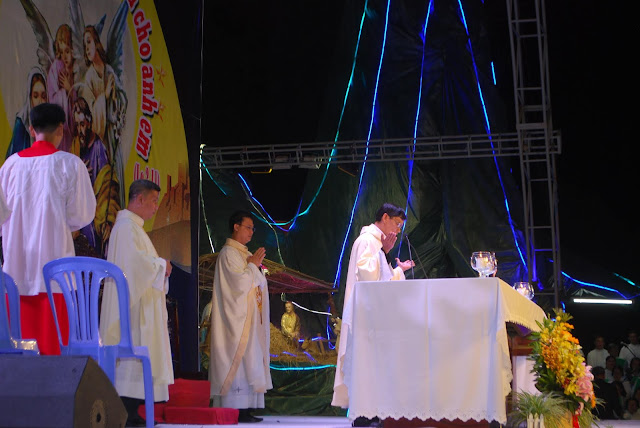 Lúc 21g00, thánh lễ do cha sở Simon Nguyễn Văn Thu và quý cha phó cùng đồng tế trong bầu không khí rất đặc biệt, bởi không làm sao diễn tả được vẻ huy hoàng của đêm Giáng sinh, trên bầu trời đêm tinh tú lấp lánh, những bài thánh ca du dương, chia sẻ bao xúc cảm từ muôn cõi lòng hướng về hang đá đơn sơ khó hèn, hình ảnh của một gia đình thánh.