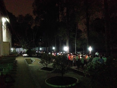 trước Hang Đá Đức Mẹ Lộ Đức chờ dự Thánh lễ và đọc kinh.